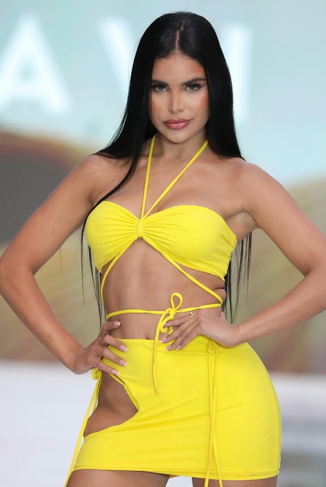 Former Sports Illustrated model Clarissa Bowers featured in our best seller Cecilia swimsuit in the shade Aqua on the runway of Miami Swim Week.